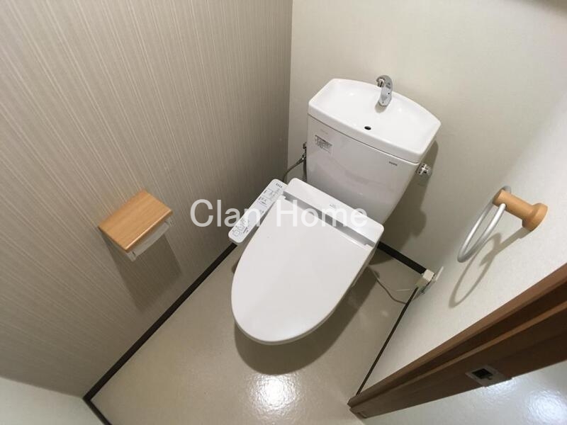 温水洗浄機能付き便座で機能性も十分なトイレ。タオル掛けやペーパーホルダーの木目調のデザインはアクセントとして可愛いデザインですね。ペーパーホルダーの上に小物が置けるのもオススメポイント。